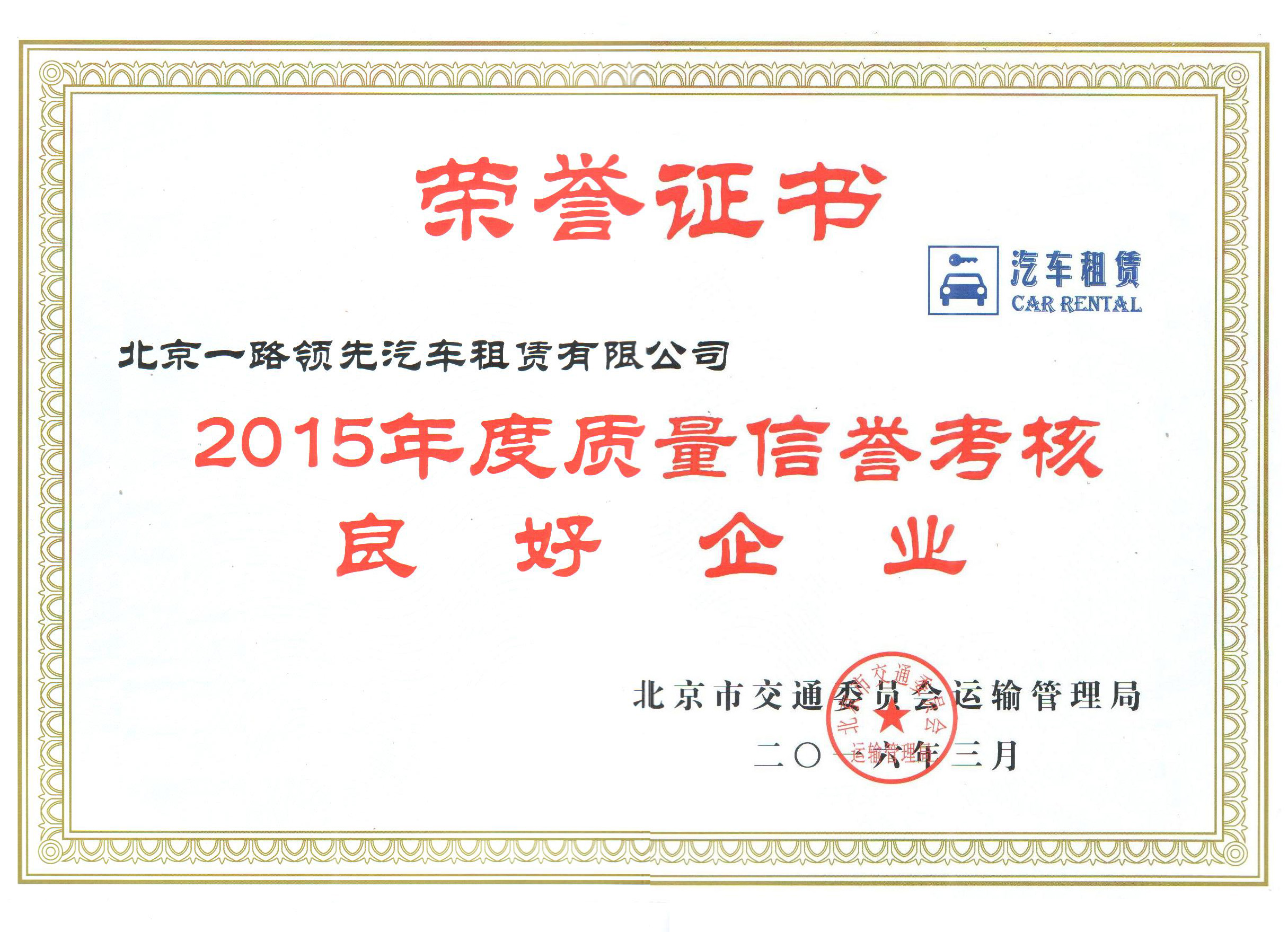 2016年04月08日熱烈慶祝北京一路領(lǐng)先汽車(chē)租賃有限公司榮獲優(yōu)秀良好企業(yè)榮譽(yù)